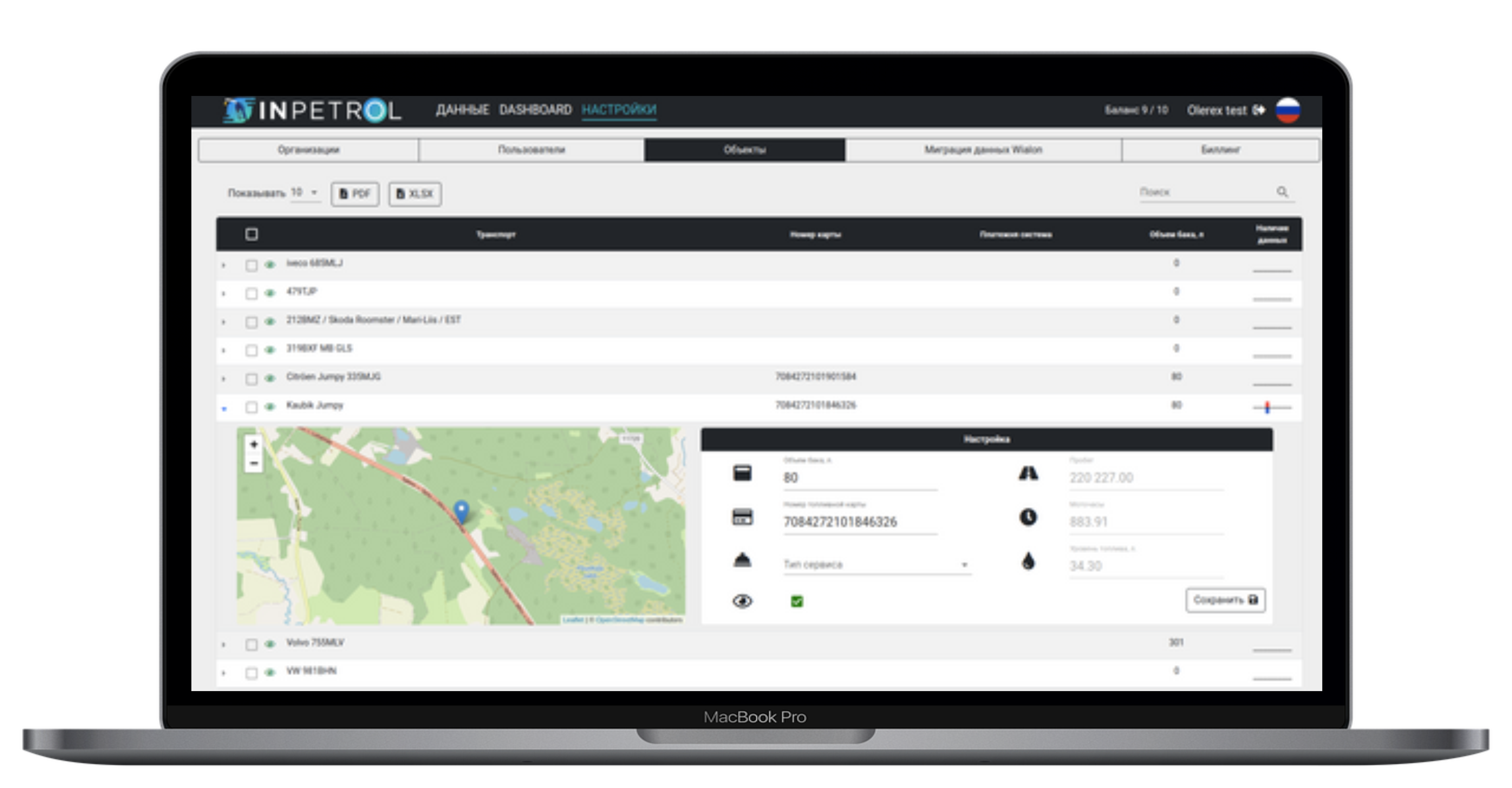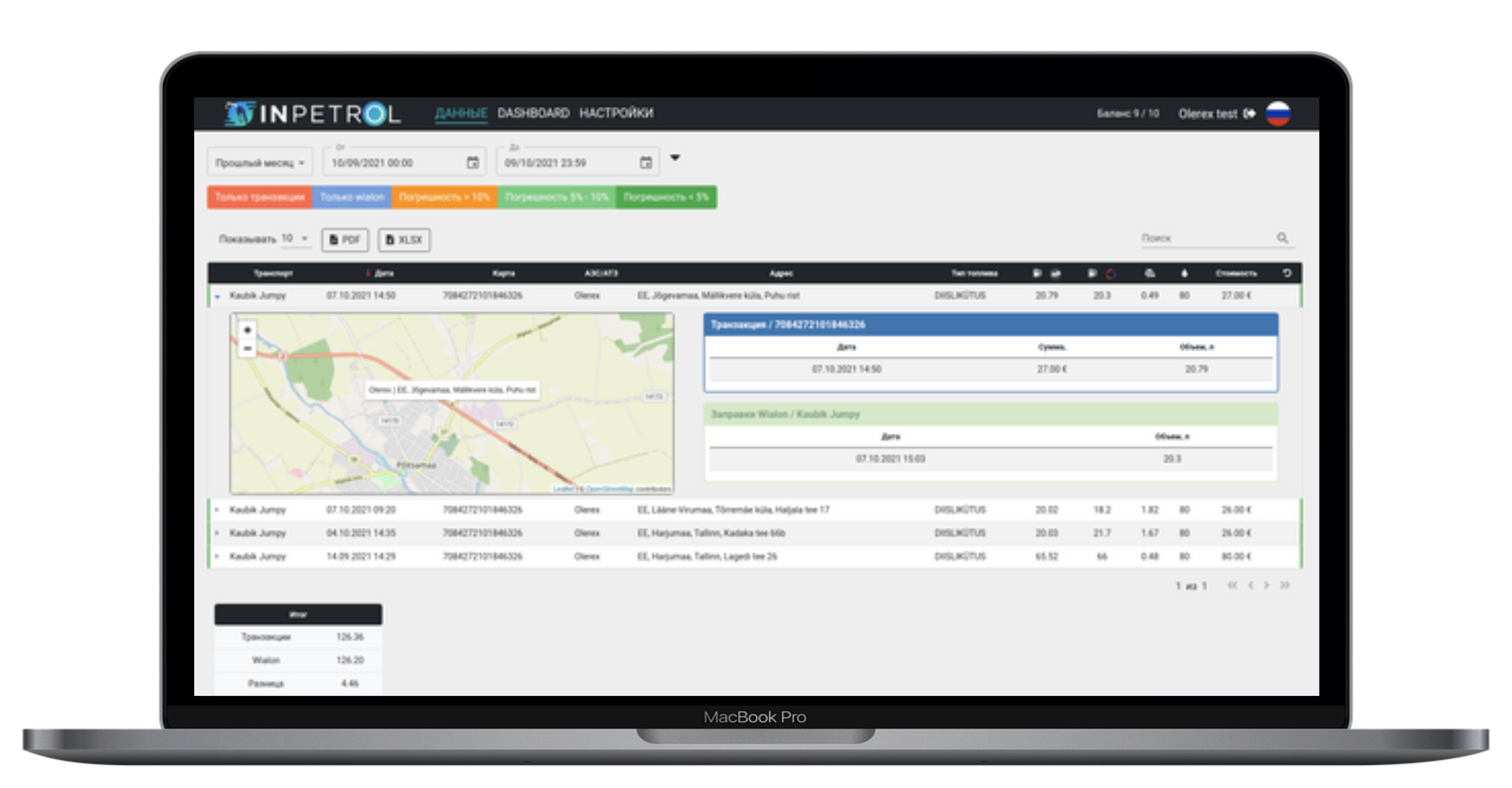 InPetrol is a system that automates the verification of data related to fuel receipts, fuel card transactions, and vehicle monitroing through the Wialon platform. The system uses a pivot table to analyze data based on criteria such as refueling time, place, tank volume, and vehicle location. The system highlights discrepancies in red and offers flexible access rights administration for users and organizations, allowing for management of multiple users and organizations within the Wialon Hosting monitoring system. Automated data downloading is possible with the right account settings in place.